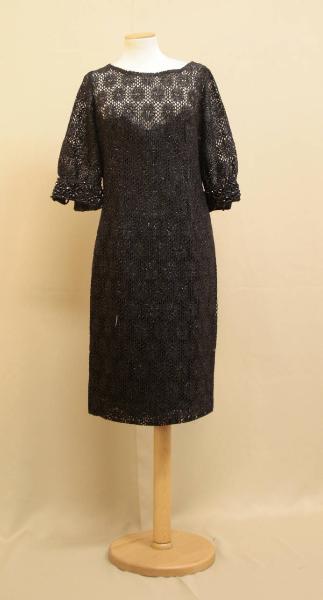 Abito corto di linea diritta, in merletto meccanico ad imitazione uncinetto, in filato nero e lurex, con motivo a corolle stilizzate. Scollo a barca, maniche a 3/4 con polsino con 2 bottoni, ricamato con perline di varie forme, Abito sagomato in vita da pinces verticali chiuse. Apertura posteriore centrale con cerniera. Fodera,dal seno all'orlo, in taffetas nero. Etichetta in nastro operato con marchio, all'interno sul fianco destro.