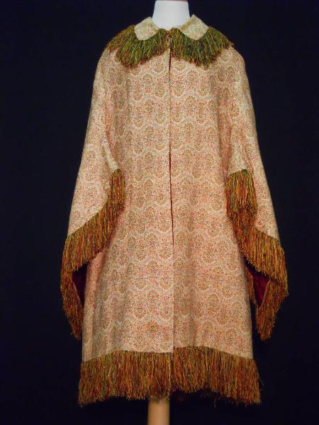 Mantello visite lungo al ginocchio, in tela operata (flotté) a fondo avorio e minuti decori rosso, nero e giallo di ispirazione cachemire. Breve scollo a V con collo piatto, apertura anteriore chiusa totalmente da 11 bottoni ricoperti e un gancio alla base del collo. Maniche lunghe a pipistrello in unico pezzo con il dorso.\nDorso con cucitura centrale, vita aderente (nastro interno stringivita) e spacco centrale.\nCollo, maniche e orlo profilati da alta frangia a telaio in seta sui toni dell'ocra, verde e nero.\nFodera in raso bordeaux trapuntata su falda di lana.