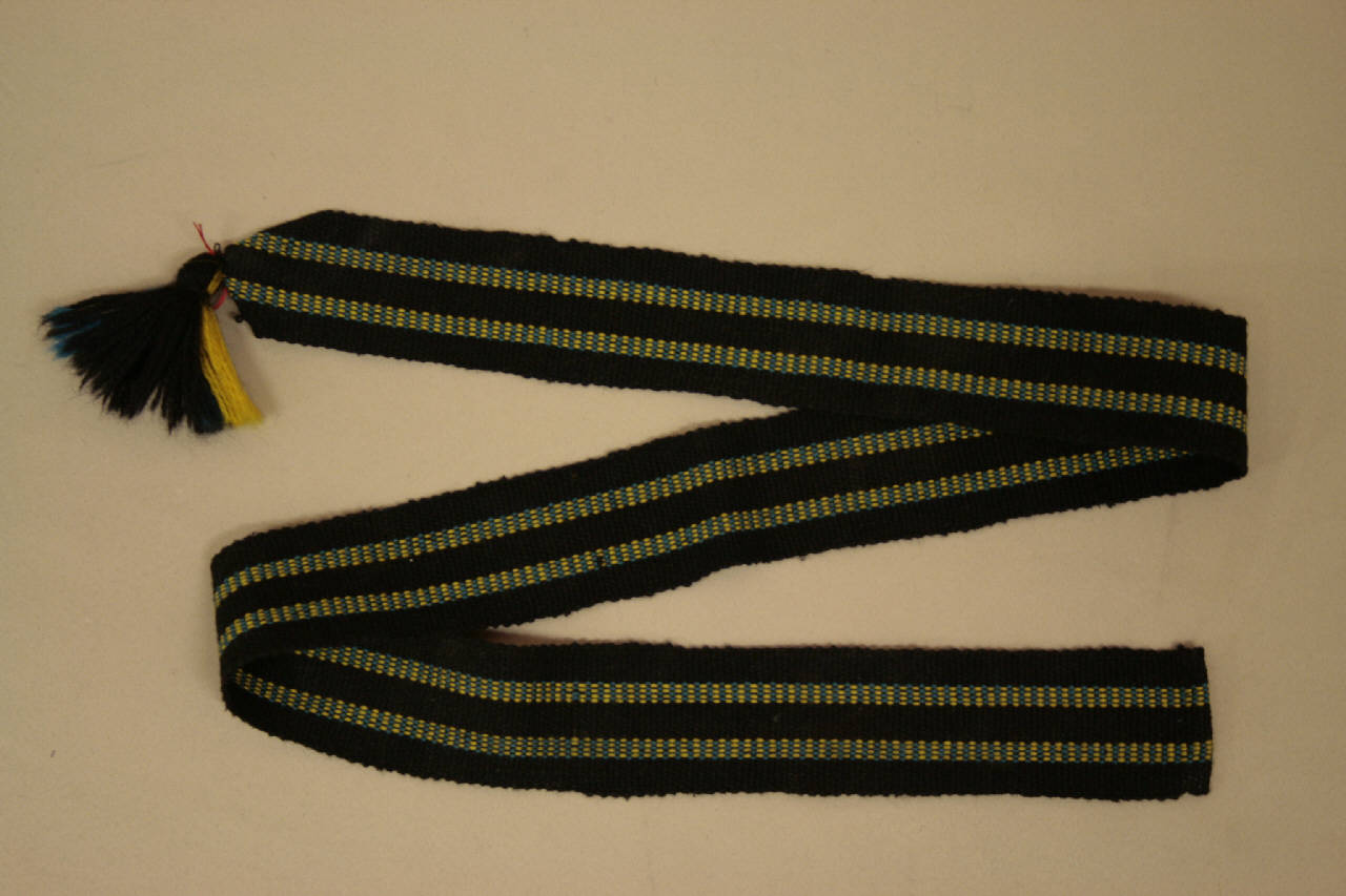 larga fettuccia in tela nera con rigature azzurro-verde e giallo. Una estremità è cucita a formare una punta a cui è agganciata una nappa a cavaliere in lana nera e azzurra-verde e giallo.