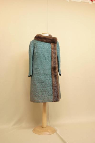completo formato da abito e soprabito lunghi appena sotto il ginocchio, in damasco verde pavone a minuto disegno astratto. Abito princesse,, con ampio scollo rettangolare, senza maniche. Sul davandi finto portafoglio sovrammesso a sinistra. Cerniera al centro dietro. Soprabito di linea diritta, scollo rotondo, chiusura a doppio petto fermata allo scollo da automatici. Maniche lunghe, diritte. Due tasche con apertura a filetto. Aggiunto collo in pelliccia di visone marrone, che profila anche l'apertura. Il damasco è doppiato con organza verde e foderato con taffetas dello stesso colore; le maniche hanno fodera imbottita e trapuntata. All'interno del soprabito una serie di bottoni suggerisce la presenza di una controfodera asportabile ora perduta.\nAll'interno di entrambi i capi, sul fianco destro, etichetta in nastro operato con marchio.