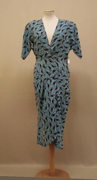 abito lungo al polpaccio, in crespo azzurro stampato con motivo di piccole maschere nere. Corpino con davanti in due pezzi, profondo scollo a V incrociato (numerosi buchini di spille usate per fermare i lembi) e corte maniche a chimono, con spalline imbottite all'interno. Dietro in un pezzo modellato da pinces. Sui fianchi alta baschina; gonna in due teli, uniti al centro dietro e sovrapposti al centro davanti dove pieghe oblique creano drappeggio che nasconde lo spacco centrale. Cerniera sul fianco sinistro. All'abito è abbinata una fusciacca modellata da pences e terminante in due estremità fittamente arricciate, profilate in taffetas nero, che si chiudono e sovrappongono mediante ganci e asole. Etichetta in nastro operato con marchio all'interno, sul fianco destro.