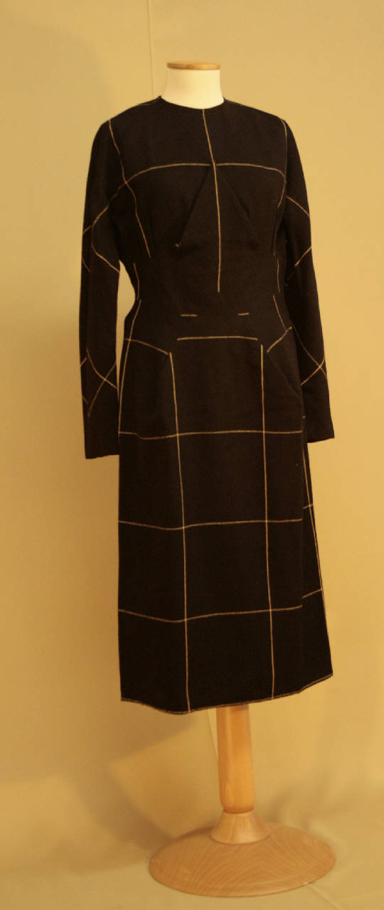 Abito lungo sotto il ginocchio in tela nera a riquadrature gialle. Corpino girocollo, con breve apertura al centro dietro con cerniera; maniche lunghe, a chimono, aderenti. In vita è inserita una fascia che, al centro davanti, forma un triangolo staccato, appuntato al centro del seno. Gonna diritta, modellata da pinces: sul davanti un motivo a triangolo reso da pinces si dispone con punta verso la vita. Cerniera sul fianco sinistro.