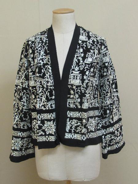 giacca chimono, lunga ai fianchi, in crespo nero con ricamo meccanico bianco, a minute fitte scene di giardino con albero e pagoda; lungo l'orlo e i polsi cornice ad elementi floreali. Tagliata in un solopezzo, con pinces sui fianchi e sulle spalle. Scollo a V e apertura centrale profilati da nastro nero. Maniche lunghe svasate al fondo.