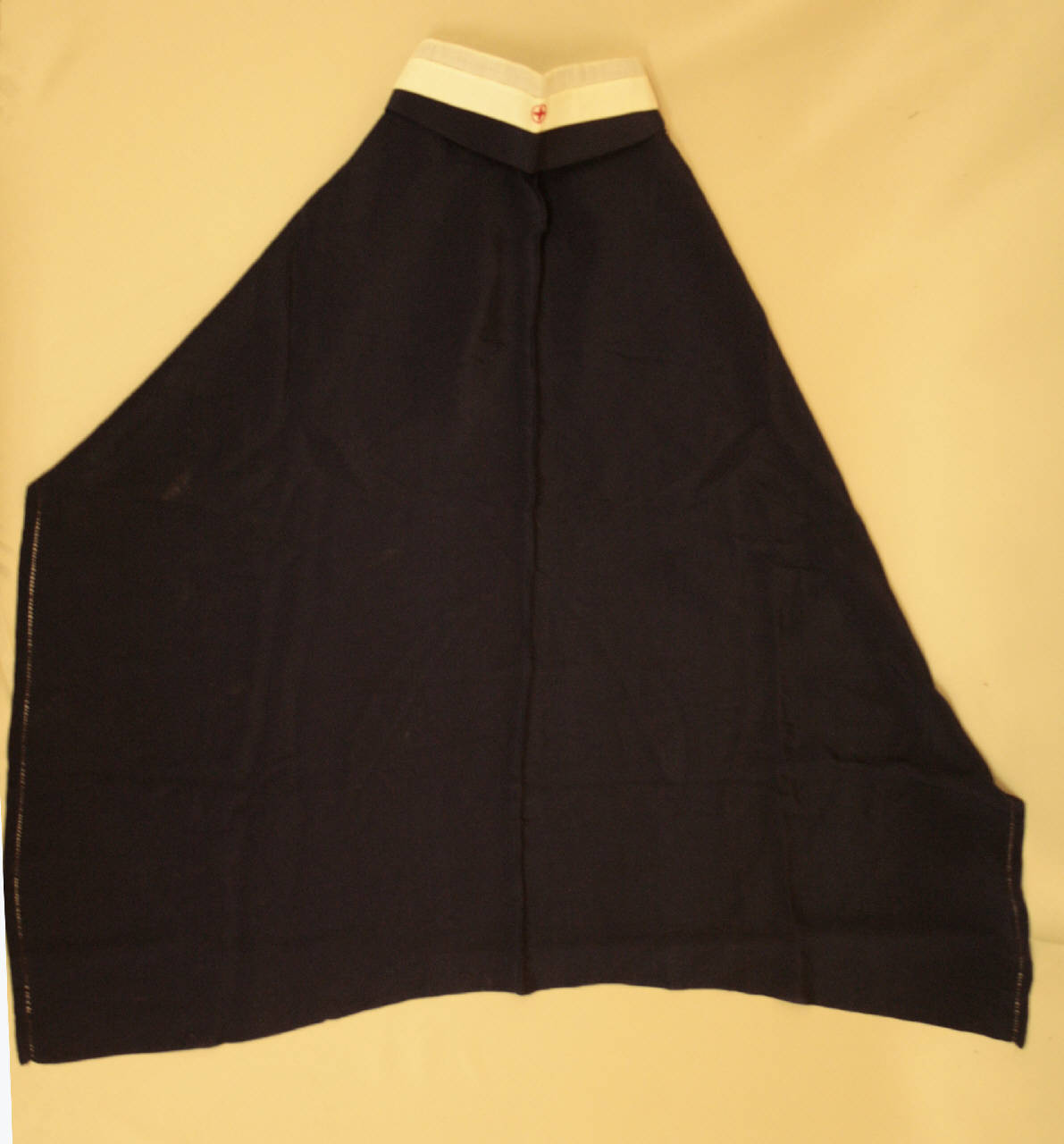 Copricapo di uniforme di rappresentanza di infermiera volontaria C.R.I.. Frontino in tela bianca inamidata, al centro è ricamata a mano la croce rossa; irrigidito da tela di canapa (?) all'interno. Al frontino è fissato un velo rettangolare in crespo blu, orlato con sfilatura a giorno. Un elastico ferma il copricapo attorno alla testa.