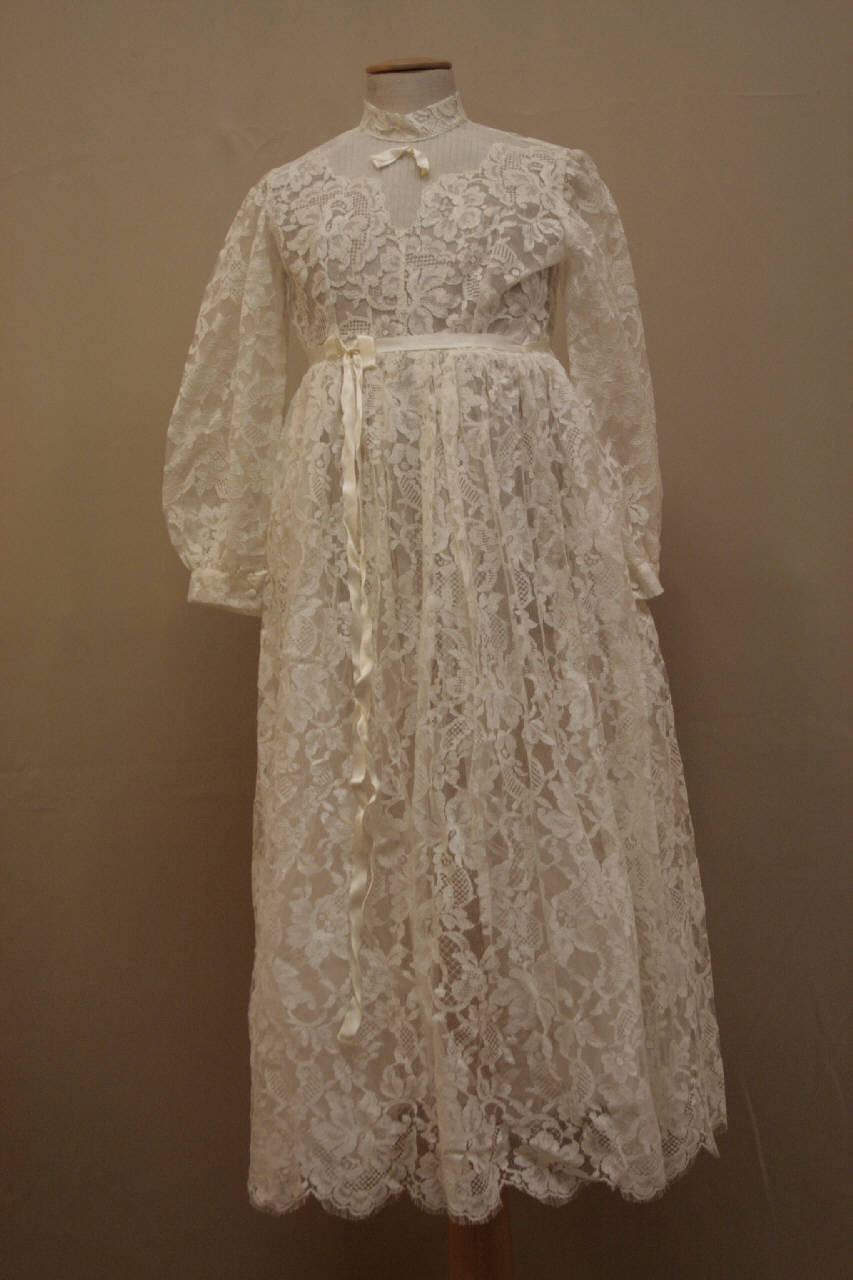 abito lungo da bambina in merletto meccanico bianco doppiato con tulle bianco. Corpino con davanti in un pezzo, con finto piccolo a cuore, velato da tulle pieghettato con piccolo fiocco di raso; collo a cinturino in merletto. Dietro in due pezzi con apertura centrale chiusa da automatici e bottoni decorativi. Lungo la vita nastro bianco con fiocco al centro davanti. Gonna a cupola arricciata in vita terminante a smerli. Abito corredato da coroncina a cuore rivestita di ruches di tulle e fiori d'arancio in carta telata, con corto velo di tulle sul quale sono incollati fiori e foglie ricavati dal merletto. Borsetta in organza ricoperta di ruches di tulle e fiori d'arancio. Fazzoletto quadrato in tela di cotonericamato a mano, a punto asola, pieno, erba, ombra.
