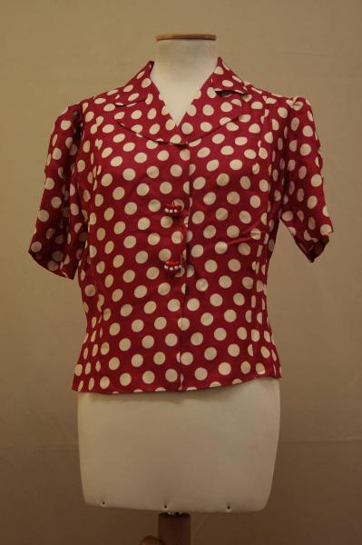 Giacca in diagonale rossa a pois bianchi, monopetto aderente con pinces, lunga appena sotto la vita. Collo a risvolti, apertura con 2 bottoni fantasia rossi con perline bianche. Maniche corte, arriciate, strette al fondo da due piegoline.