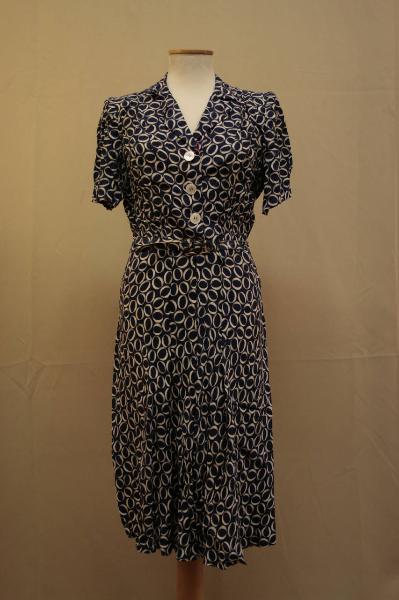 abito chemisier lungo sotto il ginocchio, in crespo stampato blu, disegno ad anelli in prospettiva, bianchi ombreggiati in grigio. Corpino di linea morbida, scollo a V con collo a risvolti; apertura fino alla vita con 3 grandi bottoni bianchi (madreperla?). Davanti in du pezzi con pinces alla vita e sulle spalle; dietro in un pezzo, arricciato al punto vita. Maniche corte, arricciate, sostenute da spalline. Apertura con cerniera sul fianco sinistro. Gonna svasata, sul davanti con 4 pieghe convergenti al centro. Cintura bassa con fibbia, nello stesso tessuto.