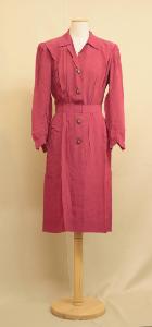 Abito chemisier lungo al polpaccio, in crespo color lampone (viscosa?). Corpino di linea morbida, con scollo a V e collo a risvolti; due pieghe dalle spalle verso il seno formano effetto di alette. Apertura che si prolung oltre il punto vita, chiusa da 4 bottoni in metallo a forma di testa di lepre. Sul dietro sprone diritto con piega orizzontale. Maniche lunghe, con spallini imbottiti; polsino con bottone.\nAl punto vita il corpino è arricciato e fermato ad una cintura inserita che raccorda la gonna. Gonna svasata con tasche sagomate inserite sui fianchi.