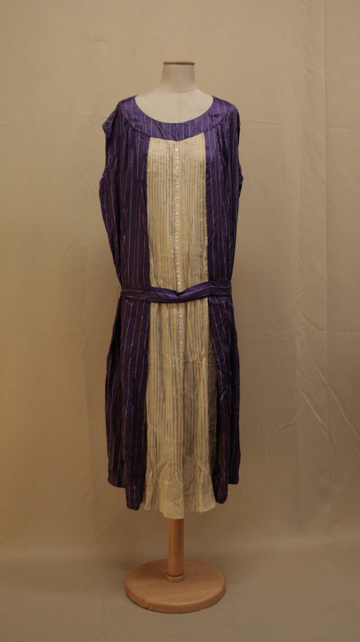 Abito a tunica, lungo sotto il polpaccio, in raso viola rigato avorio. Scollo ampio rotondo, con sprone circolare sul davanti che sostiene arricciatura. Al centro, tra due pieghe, è inserito un pannello lungo dallo scollo all'orlo, in crespo avorio a piegoline fermate da filze, decorato al centro da fitti bottoncini in madreperla bianchi. Dietro in un solo pezzo. All'altezza dei fianchi è fissata sulle pieghe una cintura dello stesso tessuto.