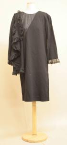 abito a tunica, corto al ginocchio, in diagonale nera, con finta mantella. Girocollo, maniche lunghe diritte profilate al fondo da merletto nero; al centro dietro apertura con cerniera e bottone. Spallini imbottiti. Sulla spalla destra è fissato un pannello, uguale sul davanti e sul dietro, stondato in basso e profilato da merletto nero, che si dispone con drappeggi verso la spalla sinistra, dove i pannelli sono fermati uno sull'altro da automatici. Fodera in taffetas nero. Etichetta in nastro operato con marchio, all'interno, nel bordo scollo.