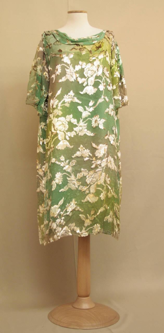 completo formato da abito e soprabito. Abito a tunica, lungo sotto il ginocchio, in velluto tagliato, con fondo in crespo stampato on toni verdi con effetto a macchie, e fiori bianchi e oro resi in velluto. Scollo a barca, arricciatura sulle spalle, maniche ampie a 3/4. Fodera nello stesso taffetas verde chiaro del soprabito. Soprabito della stessa lunghezza, in taffetas verde chiaro. Girocollo con sprone diritto, sul davanti e sul dietro, che sostiene fitta arricciatura. Lo sprone è doppiato con crespo verde. Chiuso da un automatico alla base dello sprone. Maniche ampie a 3/4.