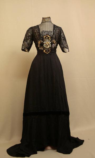 Abito lungo con strascico, confezionato in crespo nero. Corpino in merletto nero, aderente con leggero rimborso sul davanti e vita rialzata sul dietro, segnata da fascia di crespo con pieghe orizzontali. Scollo rettangolare con pettorina, con collo a guimpe steccato, in tulle nero e dorato sovrapposti, ricamati a righine di perline nere di jais. Sul davanti, sotto il seno, una grande deorazione cruciforme, ricamata su tulle a motivi floreali oro e nero, con strass, perline, conterie dorate e foglie in madreperla sottilissima. Decorazione analoga più piccola sul dietro. Fodera in taffetas avorio rosato (di sostituzione?). Gonna a calice, in 3 teli, piatta sul davanti e arricciata sul dietro, decorata sotto il ginocchio da un giro di nastro di velluto: il nastro nasconde una leggera arricciatura, in parte scucita, che raccoglie l'ampiezza della gonna. Fodera in raso nero con alta balza a pieghe. Etichetta in nastro operato con marchio, all'interno al punto vita.