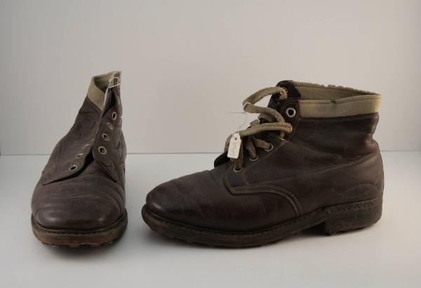 Scarponi con tomaia in pelle (di vitello) marrone, chiusi da lacci (uno perduto) passanti in sei coppie di occhielli in metallo, praticati sul prolungamento anteriore dei gambini. Punta quadrata; soffietto in pelle marrone. Gambino alto alla caviglia, profilato in panno avorio. Tirante in nastro operato con marchio.\nFodera della tomaia in pelle nocciola, suoletta in tela.\nSuola e tacco basso a più strati di cuoio, chiodati.