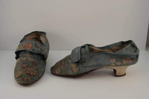 scarpe con tomaia in tre pezzi in louisine, broccato, a fondo azzurro e decoro policromo probabilmente a meandro, con fiori fiocchi e nastri a pizzo bianchi. Mascherina con linguetta che copre il collo del piede, gambini in due pezzi prolungati sul davanti, terminanti con cinturini che si sovrappongono alla linguetta. Perduto il sistema di chiusura, restano tracce di punti nei cinturini. Scarpa destra e sinistra indifferenziate. Scollatura e cinturini profilati da nastro di louisine azzurro. Punta rotonda, tacco basso a coda e a rocchetto in legno ricoperto in pelle bianca. Fodera in tela bianca; suoletta in cuoio (sostituita?). Suola in cuoio che si prolunga a coprire la gola del tacco, sotto le suole è applicato uno strato di feltro marrone molto consunto.\nSu uno dei tacchi è scritto a matita "£:3".