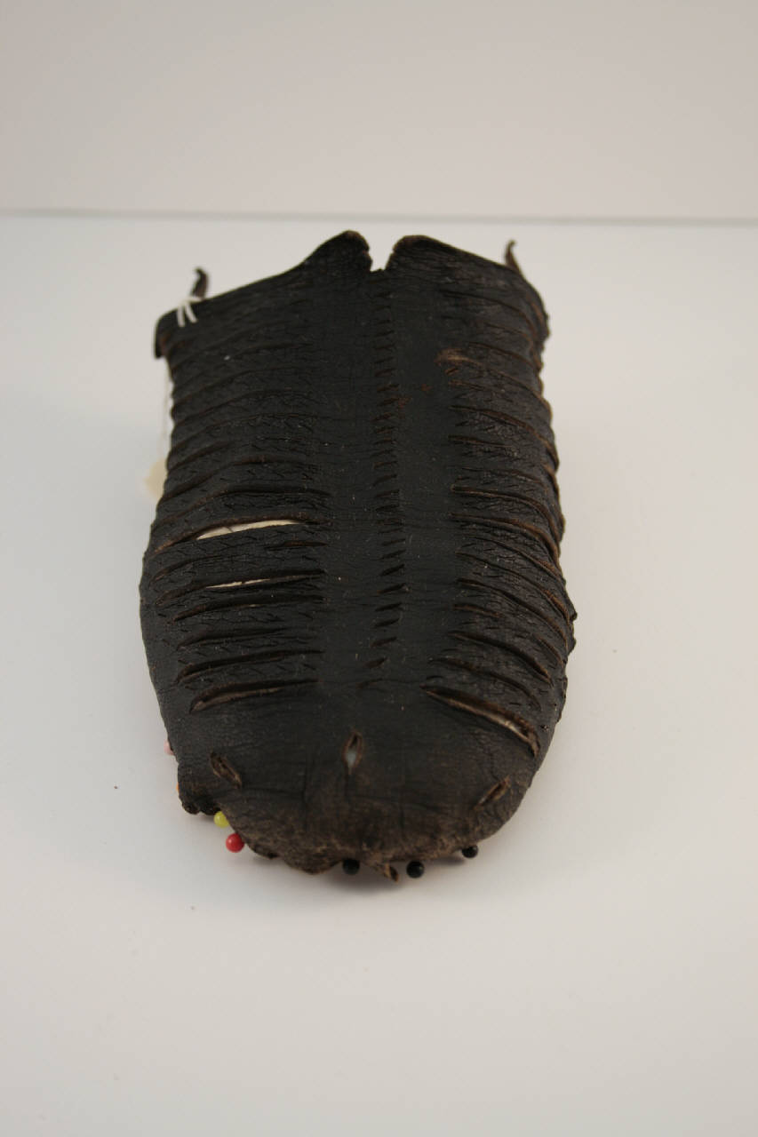 Mascherina per pianella o scarpa, in pelle marrone scuro-nero, decorata simmetricamente con due serie di tagli orizzontali separati da riga centrale di minuti tagli obliqui. Nelle fascette tra i tagli orizzontali piccole incisioni oblique; in punta tre tagli posti a ventaglio. Il bordo verso la suola presenta fori regolari; i margini posteriori mostrano fori e segni di cuciture.