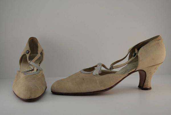 scarpe modello d'Orsay con cinturino, in louisine avorio e pelle argentata. Cinturino a T in louisine avorio, con passante in pelle argentata che forma motivo a goccia sulla mascherina, chiuso da bottone con strass. Punta sfilata, tacco medio in legno, a coda, ricoperto dallo stesso tessuto; bordino argentato al sottotacco. Fodera e suoletta in pelle bianca (capretto?). Suola in cuoio che si prolunga a ricoprire la gola del tacco.\nNella suoletta timbro dorato riportante "Perugia - B.te SGDG NICE 11 Faub.g St. Honoré - PARIS".\nEtichetta in nastro operato inserita all'interno "Modele deposé N°20885 pre. 44330 Made in France"\nNella suola è impresso "Perugia" e scritto a mano 7291 su entrambe.