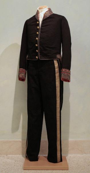 Pantaloni in panno nero di linea diritta, con bande laterali in gallone dorato con decoro a rigature. Alti in vita, senza cintura, con bottoni predisposti per bretelle davanti e dietro; sul dietro cinturino regolabile con fibbia. Patta verticale chiusa da bottoni in osso con abbottonatura nascosta. Tasche tagliate al punto vita e tasche sagomate inserite nelle cuciture laterali, chiuse da bottone rivestito. Fodera in vita e nelle tasche in diagonale di cotone avorio. All'interno dell'orlo 2 bottoni predisposti per sottopiede.