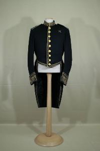 Composta da frac e pantaloni in panno blu. Giacca tagliata in vita; apertura con 9 bottoni dorati. Collo a cinturino, maniche in due pezzi con alto paramani. Ai lati dell'apertura, sul collo, paramani e lungo le falde, ricami dorati (oro filato, canutiglia, paillettes) a punto posato, raffiguranti folgie di ulivo e quercia e fiori (pansè); lungo i profili nastri incrociati a 8 su cornice lineare. Spalline ricamate con motto FERT sormontato da corona e scettro. Davanti, sulla spalla sinistra è ricamata la corona su pugnali incrociati. \nSul dietro lunghe falde stondate, con spacco centrale affiancato da due finte pieghe decorate da bottoni dorati. \nPantaloni di linea diritta, con bande laterali in gallone dorato con decoro a tralcio di quercia e spighe. Alti in vita, con cintura, bottoni predisposti per bretelle davanti e dietro; sul dietro cinturino regolabile con fibbia. Patta verticale chiusa da un gancio e da bottoni in osso con abbottonatura nascosta. Sul dietro tasche a filetto chiuse da bottone. Fodera della cintura e delle tasche in tela avorio. All'interno dell'orlo sottopiede elastico fermato da bottoni.\nAll'interno della cintura, sul davanti etichetta in nastro operato riportante "Fratelli Reanda - ROMA Sig...." aggiunto a inchiostro "758 - 29-30 S.E. Dino Alfieri"