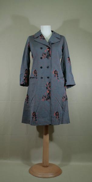 abito robe-manteau, lungo al ginocchio, in jersey operato a fondo grigio seminato a gocce color corallo, decoro a gruppi di fiori corallo e neri posti a scacchiera. Apertura anteriore totale, a doppiopetto, chiusa da 4 coppie di bottoni in plastica neri e occhielli corripsondenti. Ampio collo con risvolti; maniche lunghe con spacco chiuso da 2 bottoni con occhielli. Tasche orizzontali a filetto, sui fianchi.\nDavanti in due teli, dietro in due teli con fianchette che formano linea svasata. Fodera in taffetas nero. \nEtichetta in nastro operato.