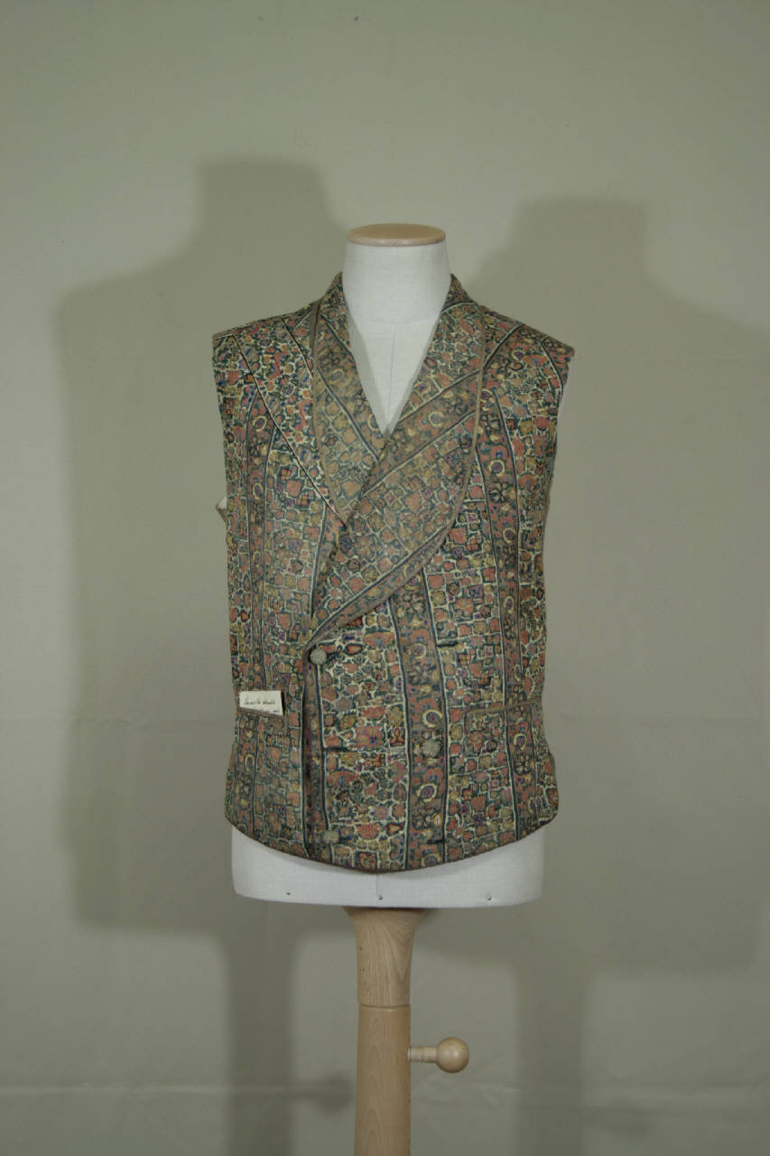 Gilè doppiopetto, lungo poco oltre la vita, in tela fittamente ricamata a mezzopunto con cordoncini in seta policroma; il disegno, fitti motivi vegetali di ispirazione persiana, è suddiviso in bande verticali a fondo bianco o senape, definite da righe verde scuro. Scollo a V con ampio collo a scialle, chiuso da 6 coppie di bottoni ricoperti ad ago, con occhielli corrispondenti. Diritto al fondo, tasche orizzontali con patta cucita. Mostre, collo e patte profilati da fettuccia in diagonale rigata. Dorso in diagonale nocciola, regolabile da coppia di cinturini con fibbia. Fodera in tela di cotone naturale.\nNella tasca è inserito un cartoncino con iscrizione (vd foto).