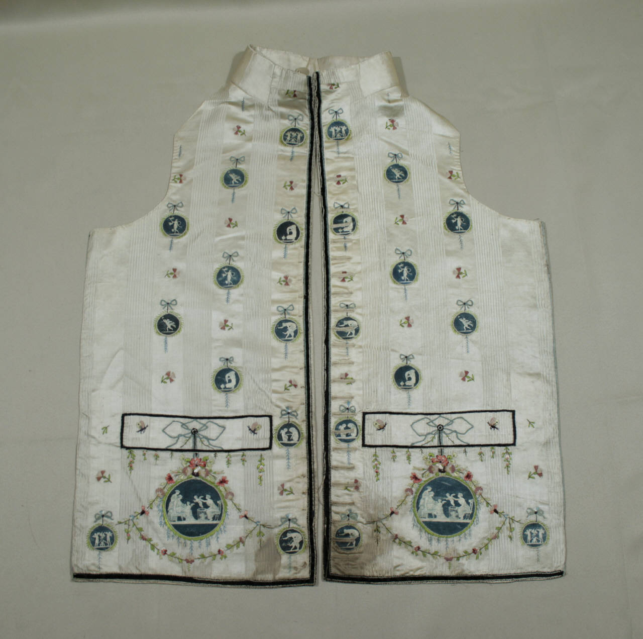 Quarti anteriori di gilè, uniti al collo, in pekin (raso e taffetas liseré) avorio a rigature sottili lucide e opache, ricamo in seta policroma e ciniglia che descrive ghirlande, fiocchi e farfalle. La decorazione incornicia medaglioni applicati in raso avorio stampato e dipinto in azzurro, incollati su carta, con scene tratte da Le antichità di Ercolano. I medaglioni sono posti a schacchiera; uno più grande è posto sotto ciascuna tasca e raffigura La Venditrice di Cupidi. Lungo oltre la vita, alto collo a cinturino, mostre diritte con 22 occhielli e tracce dell'applicazione di bottoni corrispondenti (tutti perduti). Diritto al fondo, con tasche orizzontali con patta cucita. Apertura e fondo profilati da nastrino in velluto nero decorato con fili di ciniglia avorio e celeste. Rinforzi in corrispondenza di bottoni, occhielli e tasche in tela naturale. Fodera di mostre e fondo in diagonale avorio.
