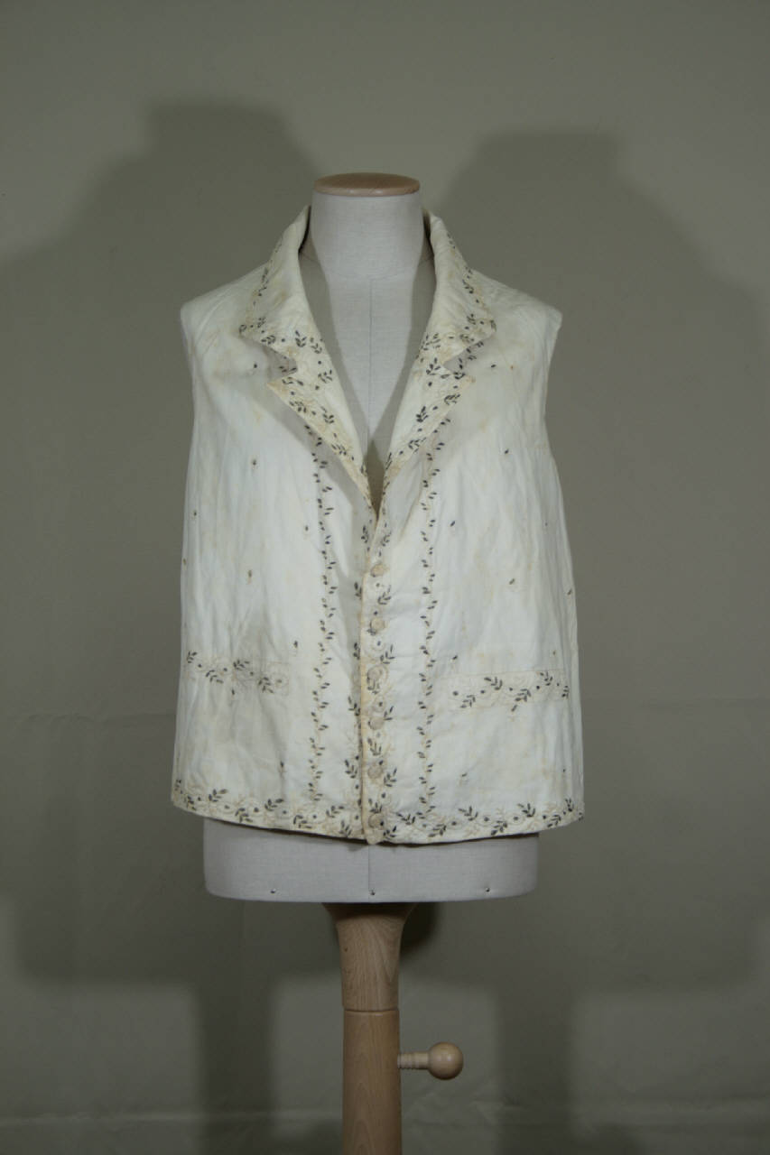 Gilè corto in vita in tela bianca, ricamatocon argento filato e cotone bianco a punto piatto e nodi e motivo di anelli perlinati con foglie bianche e argento; il ricamo è posto anche all'interno delle mostre. Svollo a V con risvolti, mostre diritte chiuse da 6 bottoni ricoperti ad ago e occhielli corrispondenti dallo scollo al fondo. Diritto al fondo, con finte patte cucite. Dorso in tela di lino bianca,quarti anteriori doppiati con la stessa tela. Allargato al centro dietro con inserimento di gherone.