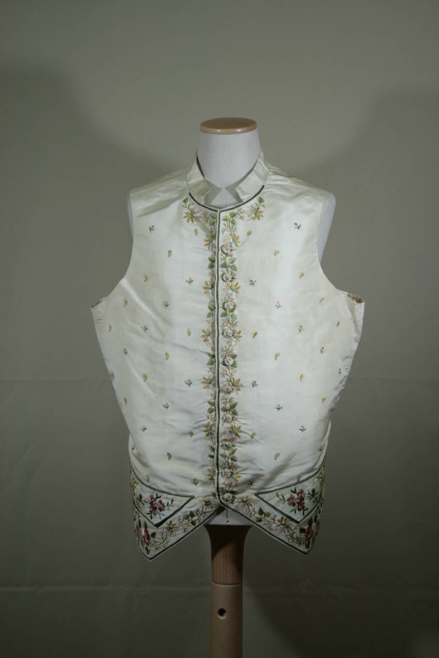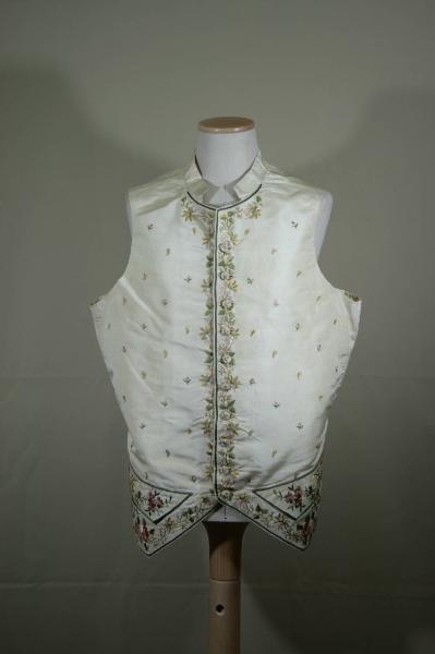 Gilè lungo ai fianchi in taffetas avorio, ricamato con seta prolicroma a punto pieno, erba, lanciato, nodi che descrivono tralcio di fiori fantastici lungo le aperture e fiori più naturalistici nelle falde e patte; lungo i bordi cornice lineare verde scuro a p. catenella. Collo a cinturino (cm2,5), apertura diritta chiusa da 10 bottoni rivestiti e ricamati e occhielli corrispondenti dallo scollo al fondo; falde divergenti a punta, con tasche e piccole patte sagomate. Dorso in tela naturale, regolabile con una coppia di lacci.\nFodera dei quarti anteriori in tela naturale, mostre e falde in leggero taffetas avorio.