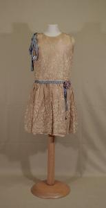 abito corto senza maniche, a vita bassa, in tulle avorio ricamato a macchina con motivo di piccoli fiori sparsi, che formano bordo verso il basso. Doppiato in taffetas rosa pallido. Corpino in un pezzo, sul davanti e sul dietro, scollo rotondo, leggera increspatura sulle spalle. Vita bassa che sostiene gonna arricciata con unica cucitura sul fianco destro. Sulla spalla destra è appuntato un lingo doppio fiocco in nastro gros di seta viola e oro filato con effetto di barrature. Lo stesso nastro copre la giunzione tra corpino e gonna con effetto di finta cintura, con fiocco e mazzolino di myosotis in velluto.