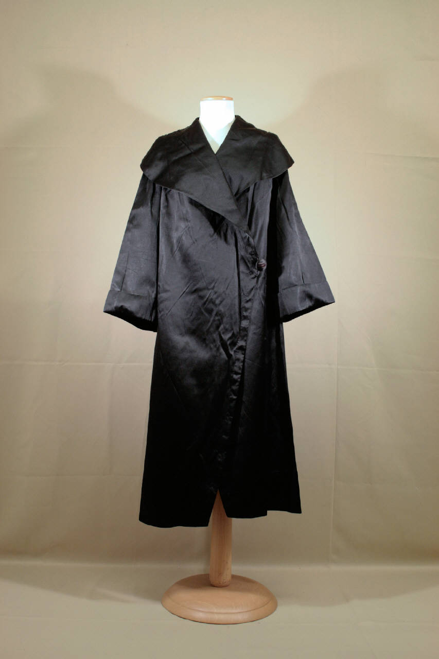 soprabito doppiopetto di linea diritta lungo sotto il polpaccio, in raso doppio all'esterno nero e all'interno rigato nero e rosa ciclamino, tagliato in un solo pezzo. Ampio collo a scialle, con parte posteriore in tulle a ricamo meccanico nero. Apertura con ampia sovrapposizione; chiuso sotto la vita da un grande bottone rivestito. Maniche lunghe svasate, con risvolto al fondo. Sul dietro, a sinistra, stretta piega cucita dalla spalla all'orlo.\nEtichetta in nastro operato all'interno, presso lo scollo, illeggibile "...ZZINO MOD..."