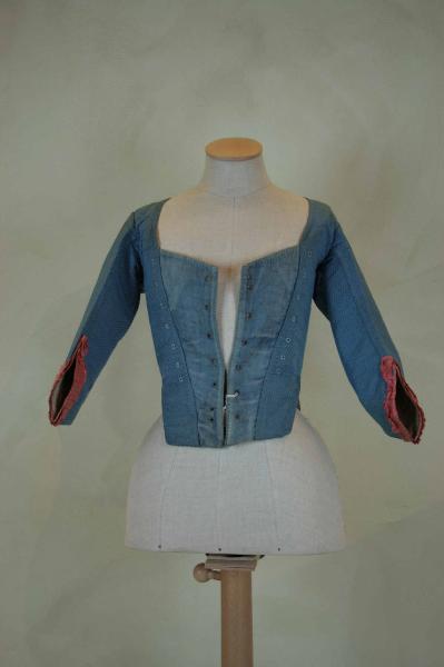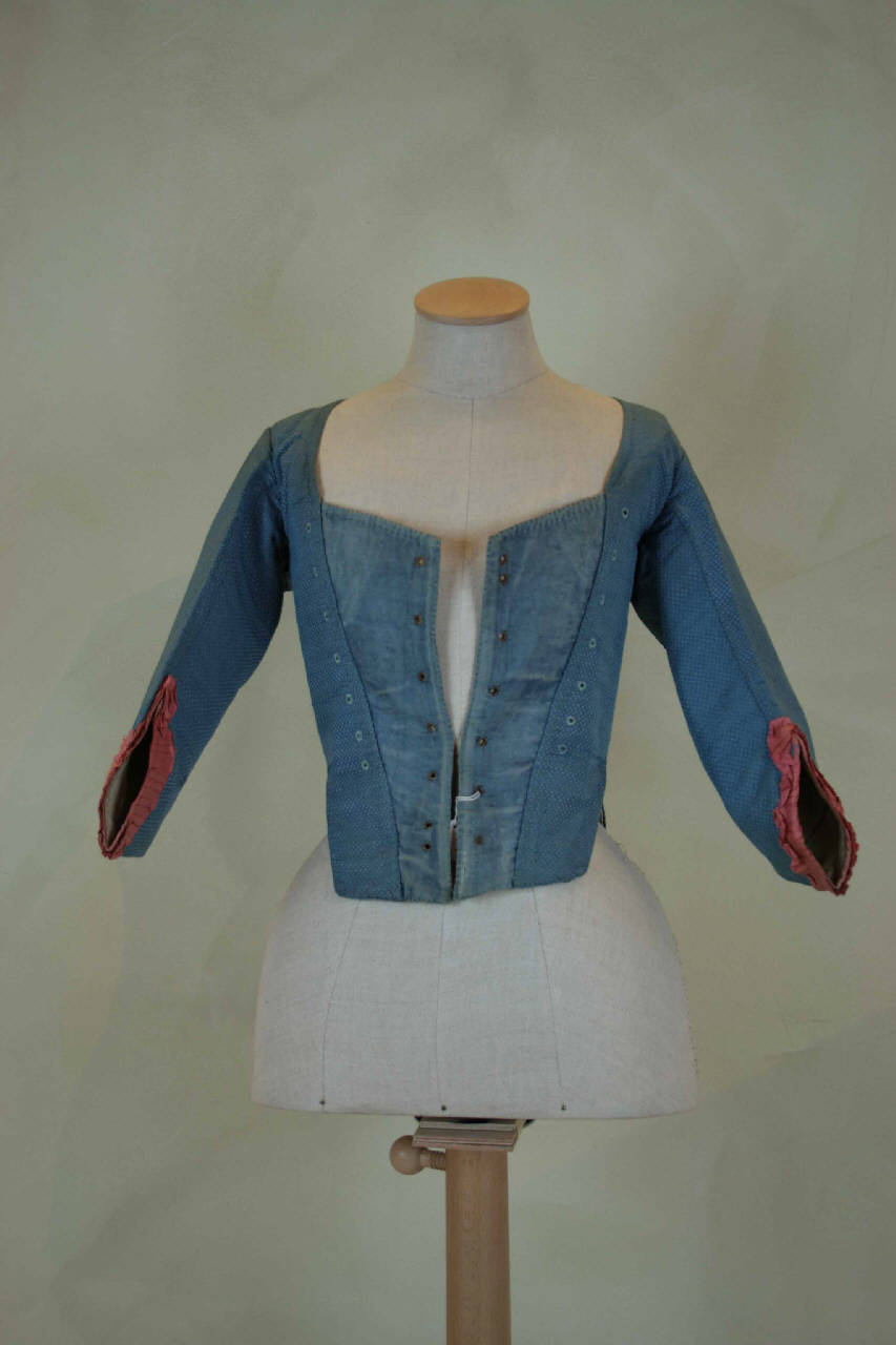 Corpino aderente in taffetas effetto gros azzurro, operato per slegature di ordito con motivo di piccoli quadrati a scacchiera. Corto in vita, con breve falda posteriore. Davanti con ampio scollo quadrato, lungo oltre la vita, in due pezzi raccordati da compares in gros marezzato dello stesso colore (tessuto di reimpiego). Nei compares chiusura a 6 coppie di occhielli tondi, più 2 per l'annodatura, per laccio passante (perduto); i compares potrebbero essere un'aggiunta successiva poichè i lembi del corpino sono dotati anch'essi di occhielli tondi per laccio passante, non funzionali nell'attuale conformazione. Dorso triangolare in 2 pezzi che formano, al centro sotto la vita, piccola coda con pieghe segnate da due bottoni rivestiti. Maniche in 2 pezzi, sagomate, lunghe al gomito e modellate da pinces. Profilate al fondo da nastro in taffetas rosa che forma anche ruche pieghettata. I pezzi del corpino sono foderati singolarmente in tela naturale, poi uniti insieme.