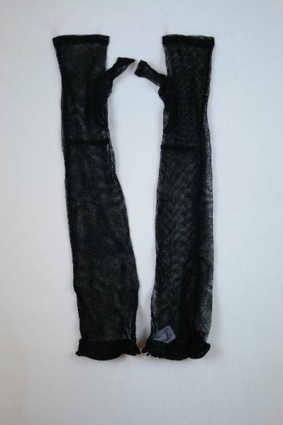 Mezzi guanti in tulle nero, operato con minuti motivi sparsi. Lunghi al gomito, con tratto di elastico cucito nella zona interna del polso e all'orlo.