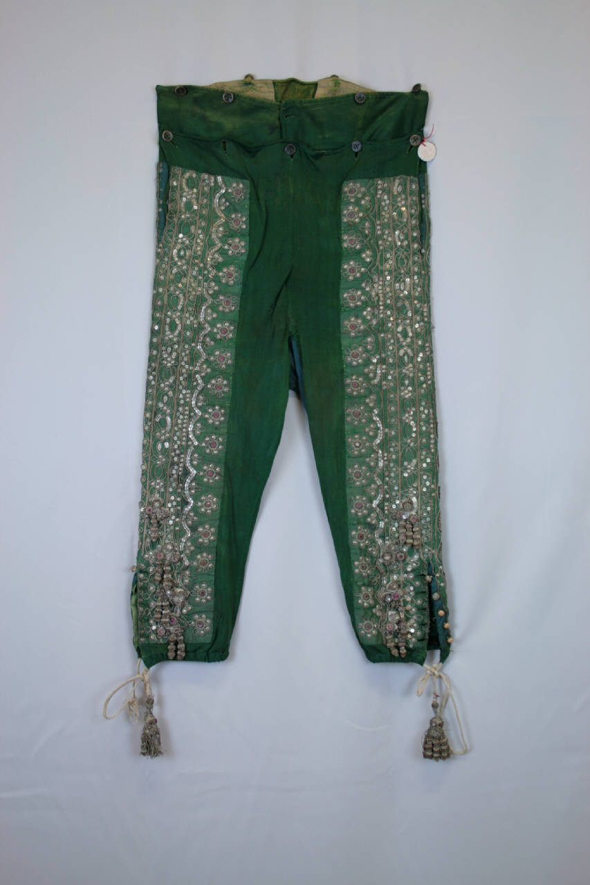 Calzoni al ginocchio (taleguilla), confezionati in sottile maglia di seta verde; bande laterali sovrammesse in taffetas effetto gros verde, ricamate con cordoncino, paillettes e canutiglia argento e lustrini rossi. Motivo a cornici verticali a diversi decori geometrici e affiancate da cornici esterne a corolle con cuore rosso. Alta cintura chiusa davanti da 4 bottoni (dei quali 1 perduto); bottoni per bretelle davanti e dietro. Larga patta alla marinara fermata a 5 bottoni (dei quali 1 perduto). Gambe aderenti, con spacco al fondo chiuso da 5 bottoni argento ricoperti ad ago (alcuni sostituiti) e occhielli corrispondenti; cinturino con coulisse formato da treccia piatta con uno dei capi terminante con nappa argento. Ai lati dello spacco 4 alamari in argento, ad ago, con jasmine pendenti. Fodera di patta e cintura in tela verde e nocciola.