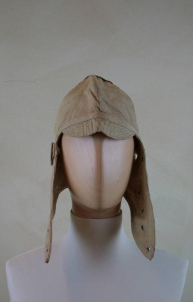 Cuffia in pesante tela nocciola, in doppio strato. Confezionata a 6 spicchi, dei quali i due laterali si prolungano a formare paraorecchie e proseguono formando il sottogola, chiudibile con 4 automatici.\nFori auricolari profilati a punto festone con aletta protettiva. Piccola visiera trapuntata. Alla cima passante cucito. All'interno nella cima un quadrato di raso bianco con timbro in nero del produttore.