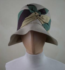 Cappello a cloche in feltro avorio; alta calotta a campana con tesa calata, più corta sul dietro. Alta cinta che forma nodo sul davanti in nastri gros nocciola, bordeaux e verde salvia cuciti tra loro in diagonale. Fodera frammentata di taffetas nocciola. Etichetta all'interno in nastro operato; etichetta in nastro stampato con numero: 32.542.