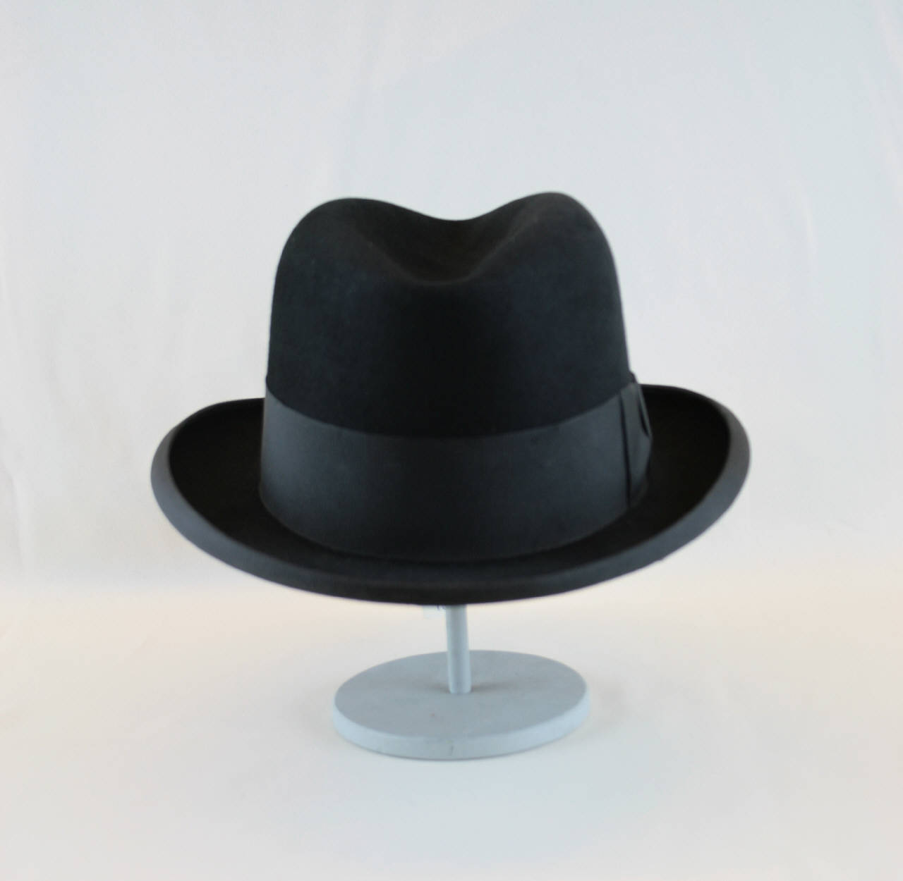 Lobbia in feltro nero. Cinta e bordo della tesa in nastro gros nero. Fodera in raso avorio; inserto nella cima con marchio, coperto da organza cerata. Giro d'entrata in marocchino con marchio dorato impresso. Due etichette in carta con iniziali del proprietario "M.Q.".