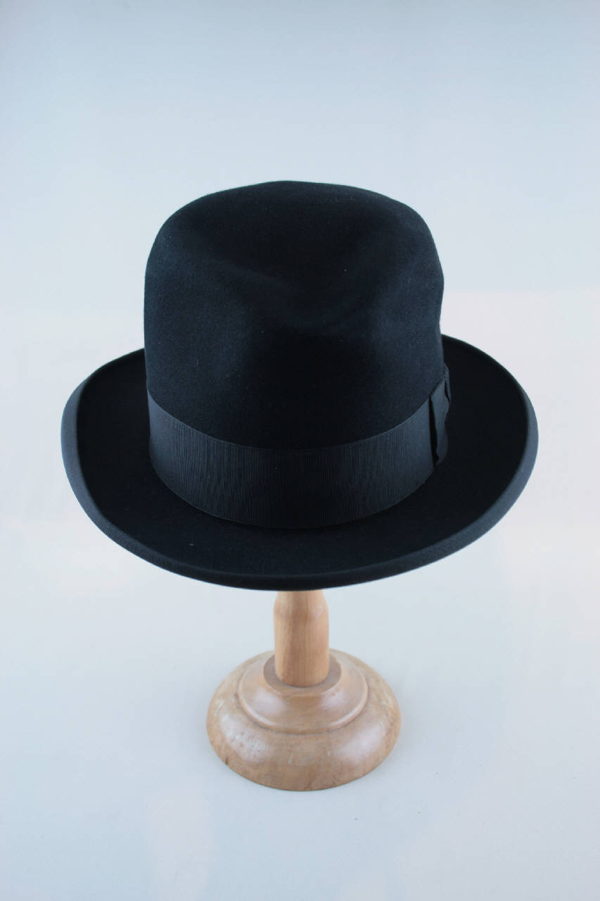 Lobbia in feltro nero. Cinta e bordo della tesa in nastro gros nero. Fodera in taffetas avorio; inserto nella cima con marchio, coperto da organza cerata. Giro d'entrata in marocchino con marchio dorato impresso.