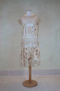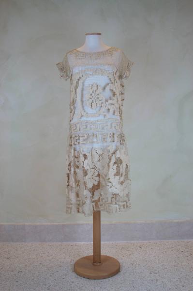 Abito a vita bassa, lungo al polpaccio, in rete color avorio a filet a grandi maglie ricamata a punto tela. Decoro a grandi girali che includono corolle, disposti orizzontalmente sul corpetto e gonna, inclusi in cornice a greca. Corpino in un pezzo, con cucitura sul fianco sinistro; scollo a barca e maniche cortissime aggiunte. Gonna in un pezzo, chiuso sul fianco sinistro; unita al corpino con leggera arricciatura. Il sottabito è mancante.