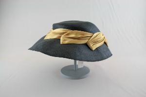 Cappellina a tesa ampia in paglia grigio antracite. Calotta bassa, tesa circolare più stretta sul dietro e leggermente convessa. Cinta confezionata a petali di raso giallo oro a fitte pieghe, disposti obliqui e sovrapposti. Giro d'entrata in gros nero ed elastico tubolare per fermarlo sotto la nuca. All'interno etichetta in nastro stampato.