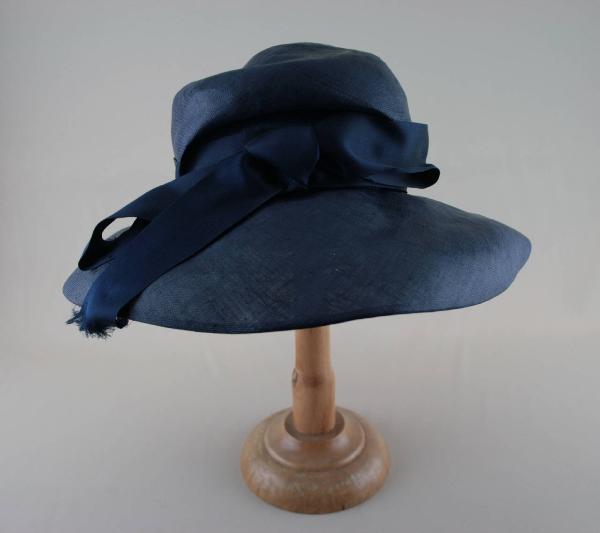 Cappello a tesa ampia di paglia blu. Calotta alta a cupola, con piega arcuata sul davanti, decorato da cinta in nastro di raso blu che forma fiocco sul davanti. Tesa circolare più stretta sul dietro, con ferrino nel bordo. Fodera in taffetas blu e tulle. Elastico tubolare per fermare il cappello sulla nuca. All'interno etichetta in nastro stampato.
