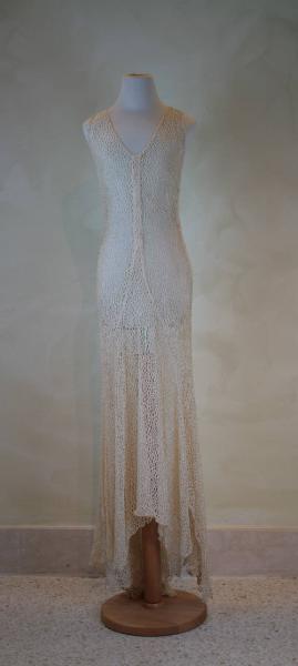 Abito senza maniche, a vita bassa, lungo alle caviglie, in merletto meccanico avorio con decoro a maglie circolari irregolari con effetto "a bolle". Corpino aderente, con scollo a V davanti e dietro, che scende con tagli stondati sotto i fianchi. La gonna, svasata e con orlo a punte, è più lunga sul dietro dove sono sovrapposti due pannelli stondati in fondo, più lunghi della gonna. Profilature in crespo avorio. Apertura sul fianco sinistro con automatici. Il sottabito è mancante.