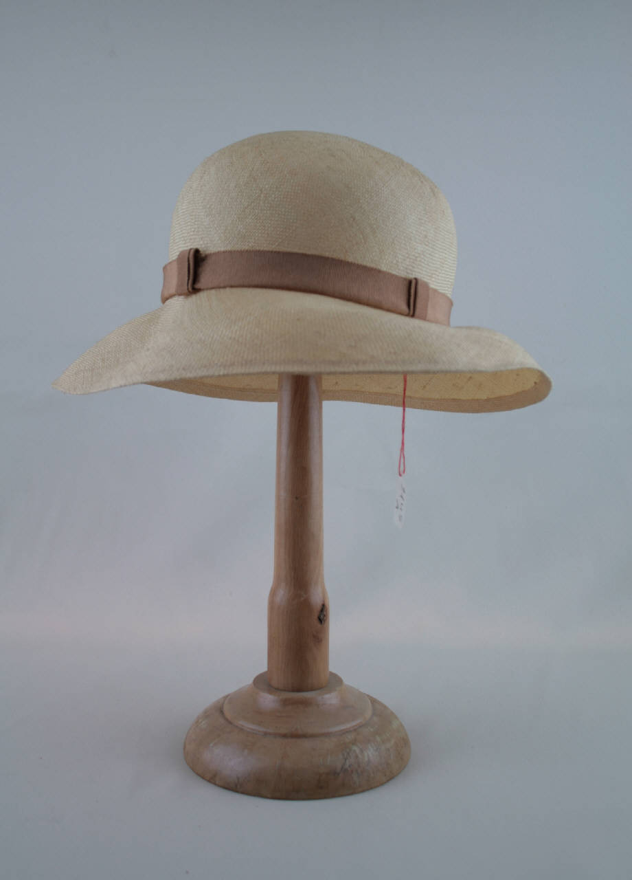 Cloche in paglia naturale in un pezzo. Calotta alta a cupola, con cinta in nastro gros nocciola con passanti sul davanti nello stesso gros. Tesa più stretta sul dietro e leggermente spiovente.