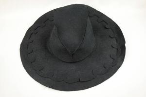 Cappello a tesa ampia in feltro nero. Calotta a forma irregolare, in 4 pezzi cuciti con margini all'esterno che creano effetto decorativo. Tesa floscia, decorata all'esterno con applicazione nello stesso tessuto, incollata, a motivo di smerli. Giro d'entrata in nastro gros nero; laccetti in gros da annodare per fissare il cappello alla nuca.