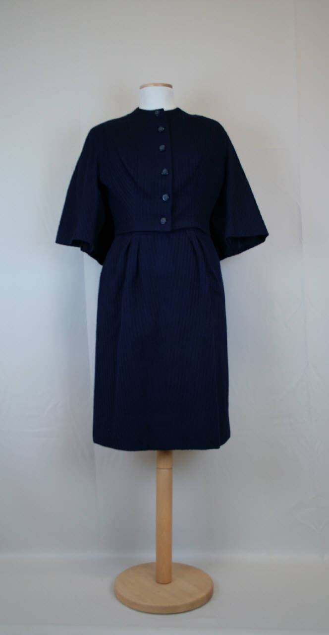 Completo formato da abito e giacca in tela blu operata con ordito supplementare che slegando forma motivi a fitti torchon verticali. Abito di linea diritta, senza taglio in vita, con scollo a barca e cortissime maniche a chimono con tassello; modellato da pinces e un taglio a U sul davanti con effetto pettorina. Dietro in 2 pezzi con piega centrale a cannone aperta solo presso l'orlo. Apertura centrale con cerniera e nastro stringivita. Giacca corta in vita, girocollo, chiusa da 6 bottoni con occhielli a filetto. Davanti in 2 pezzi modellati da pinces, dietro con mantellina sovrapposta, inserita nella cucitura delle spalle, che forma finte maniche. Fodera in taffetas blu. All'interno della giacca, nel fianco sinistro, etichetta in nastro operato con nome produttore e indicazione "Made in Ytali (sic)". Nella mostra destra è ricamata con filo bianco l'iniziale "M".