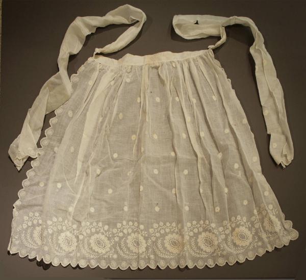 Grembiule a vita, in sottile e rigida tela bianca, ricamato a macchina a punto catenella. Motivo lungo l'orlo di grandi corolle poste in obliquo, circondate da ramoscelli e tralci di fiorellini. Sparse piccole corolle. Bordi smerati. Arricciato in vita e inserito nel cinturino da annodare.