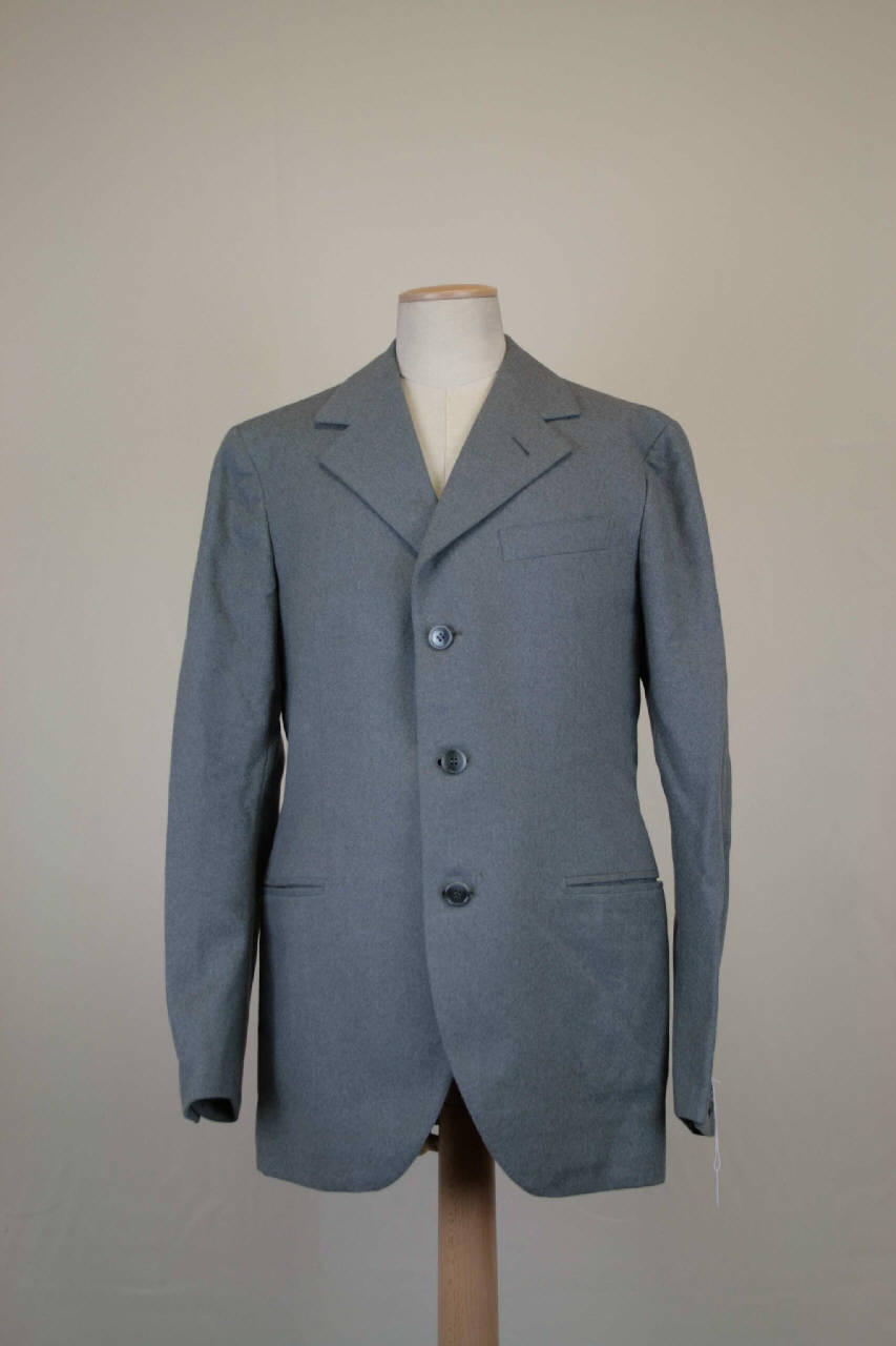 Completo classico da ragazzo formato da giacca e pantaloni corti sopra il ginocchio in diagonale grigio. Giacca monopetto a 3 bottoni (in corno?), collo a risvolti con occhiello nel risvolto sinistro. Sul davanti pinces chiuse, taschino con patta cucita e tasche a filetto. Dietro in 2 pezzi. Maniche in 2 pezzi con spacco chiuso da 3 bottoni decorativi. Fodera in taffetas grigio; nelle maniche in taffetas avorio rigato giallo e nero. Pantaloni di linea diritta, alti in vita, con 4 pinces aperte sul davanti. Cintura chiusa da bottone interno, con passanti e bottoni per bretelle all'interno. Patta verticale con 4 bottoni nascosti. Tasche verticali laterali a filetto, sul dietro a sinistra una tasca orizzontale a filetto con bottone. Fodera della cintura in taffetas rigato; tasche in tela avorio. All'interno della giacca, sul dietro, etichetta in nastro operato.