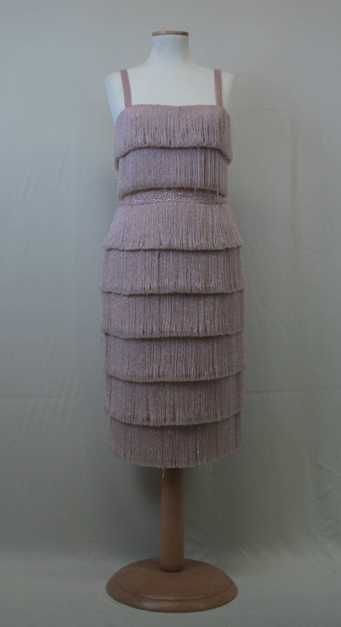 Abito rosa, aderente, senza maniche, lungo sotto il ginocchio, in tulle ricamato con paillettes a motivo labirintico (tecnica Lunèville a macchina), ricoperto da ranghi di frange di perline, fermate in alto e in basso con effetto di rimborso. Le perline trasparenti sono infilate in cordoncini rosso lampone che dànno sfumatura rosata alle perline. Scollo totale diritto, con sottili spallini ricoperti di perline. I ranghi di frange lasciano scoperta in vita una banda del fondo in tulle ricamato che crea effetto cintura. Il tulle, doppio, è fermato in corrispondenza dei ranghi di frange ad un sottabito in taffetas rosa che nella gonna è doppio e irrigidito da controfodera. Apertura al centro dietro con cerniera.
