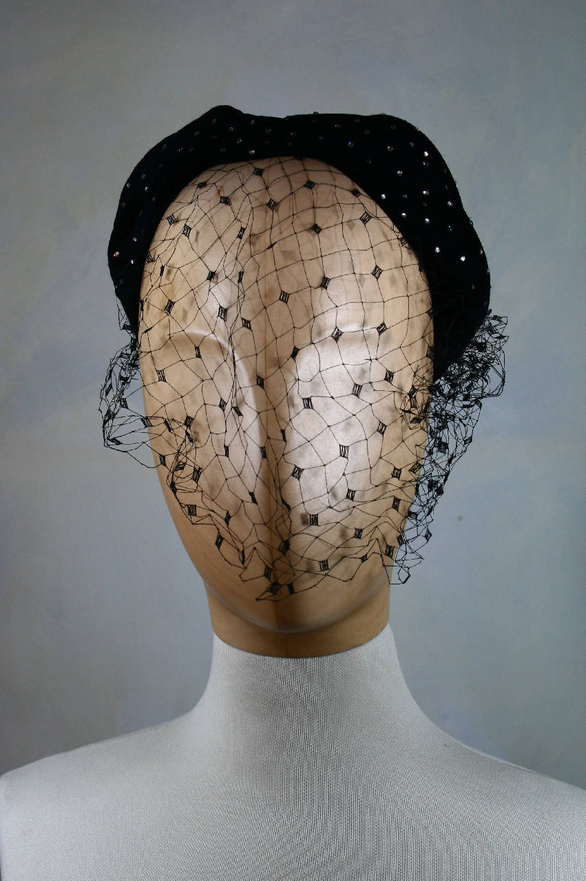 Cappello a toque in velluto riccio nero, seminato di piccoli strass cuciti a scacchiera. Bassa calotta sagomata sul davanti da pieghe posticce fermate da spilli. Struttura in materiale rigido non visibile, fodera in taffetas nero,giro d'entrata in nastro gros nero. All'interno, dietro, etichetta in nastro stampato con marchio, a cui è aggiunto a mano il n. 192. Al cappello è abbinata una veletta in tulle nero.