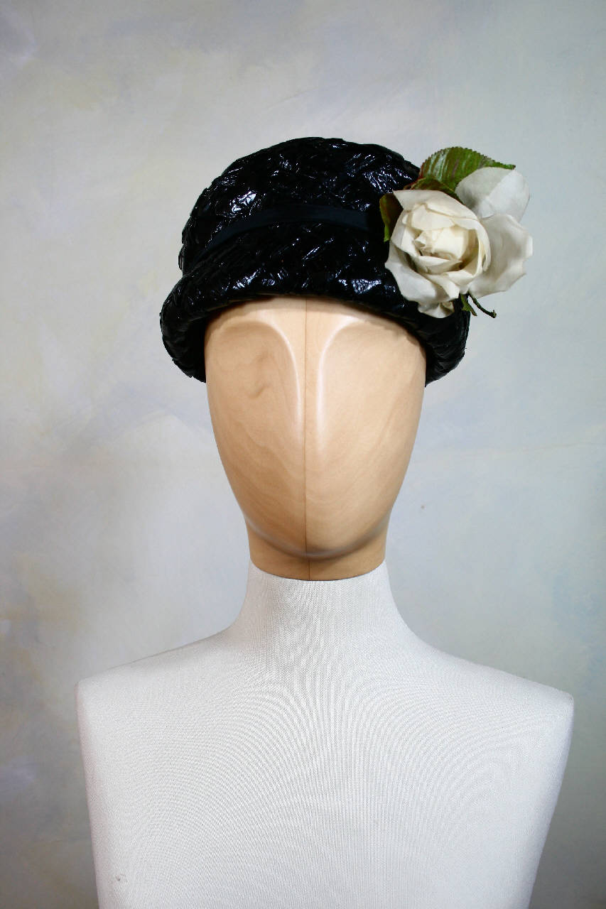 Cappello a toque in paglia sintetica nera lucida a largo nastro intrecciato ad effetto tela. Calotta formata da fascia che sormonta sulla cima a disco. Un nastrino in raso nero cinge a metà altezza la calotta e trattiene, sul davanti a sinistra, una rosa in taffetas avorio con foglie. Struttura in tulle rigido, giro d'entrata in nastro gros nero. All'interno etichetta in nastro operato.