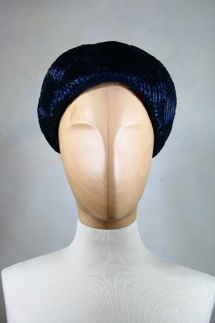 Cappello a toque blu con calotta bombata, in largo nastro di paglia sintetica intrecciata con fili di nylon blu. La cima è realizzata con largo nastro di paglia ripiegato a spirale a formare un fiore. Struttura interna in rete di nylon blu. Giro d'entrata in gros blu: all'interno una coulisse regolabile con filo di paglia da annodare. All'interno dietro è cucito un pettinino per il fissaggio.\nAll'interno, davanti, etichetta in nastro operato.