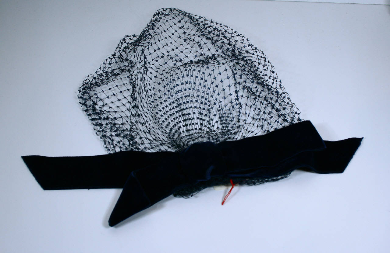 Veletta ovale in tulle blu, decorata da nastro in velluto blu che forma fiocco piatto. All'interno è cucito un pettinino per fissaggio. Etichetta in nastro.